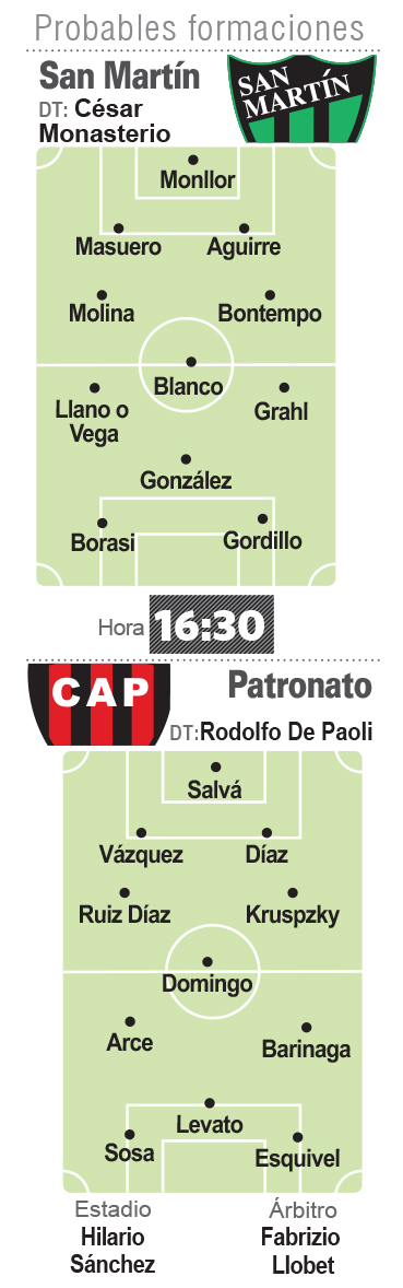 En lo futbolístico, la caída en el parque mendocino sacó de la cancha a uno de los nombres fijos como Nicolás Pelaitay. Esa vacante en el sector derecho del mediocampo tuvo dos pretendientes a lo largo de toda la semana: Manuel Llano y Alexis Vega. El técnico sanjuanino probó con los dos y el ex Newells y Godoy Cruz, parece ser el elegido por encima de Vega que llegó en la ventana de las incorporaciones y había tenido minutos contra Aldosivi y también ante Gimnasia. Con ese panorama, en el resto de la formación no se avizoran más modificaciones, respetando modelo y nombres aunque con la inquietud de buscar más contundencia en el ataque, algo que ha sido el Talón de Aquiles de este San Martín que genera, llega pero no concreta todo lo que insinúa. Así, la formación verdinegra tendrá a Monllor en el arco; Molina, Masuero, Aguirre y Bontempo serán los cuatro del fondo, mientras que Llano o Vega acompañarán a Blanco y Grahl en el medio, quedando Sebastián González en la creación. Arriba, Borasi y Gordillo serían los elegidos pero hay otras opciones que no pierden consideración. Enfrente estará el Patronato de Paraná que desde hace una fecha conduce Rodolfo De Paoli. El equipo entrerriano decidió cambiar entrenador y el debut del relator fue exitoso ganándole a CADU como local. El peso del partido es de San Martín.