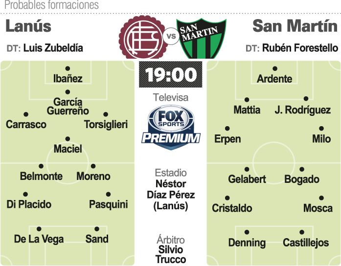 El equipo de Forestello presentará dos cambios: ingresarán Juan Rodríguez y Gonzalo Castillejos por Silva y Palacios Alvarenga, respectivamente. No la tendrá fácil porque se enfrentará a Lanús, que logró 18 de los últimos 21 puntos que disputó y está a un paso de ingresar a la zona de clasificación de la Copa Sudamericana. El Granate bajo la conducción de Luis Zubeldía, lleva seis triunfos en las pasadas siete presentaciones, sumando 30 unidades y posicionado décimo, a un paso de la zona de ingreso a la Sudamericana 2020. San Martín se jugará una carta clave hoy. No será fácil, pero en el fútbol los imposibles no existen.