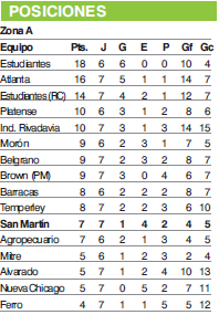 Era el momento. Parecía que era la hora de cantar victoria en San Martín jugando en San Juan pero todo quedó en la nada. La semana parecía indicar un domingo feliz en Concepción pero la contundencia de Temperley terminó amargando al Pueblo Viejo, asestándole un golpe feo e inesperado a este San Martín, derrotándolo por 2-1 y marcando que festejar como local es misión imposible. Fueron espasmos de bueno juego en San Martín, ratitos de juego asociado, de profundidad mezclados con esa inexpresividad que lo hace vulnerable. Esa irregularidad, fue su condena. Es que el Gasolero, con orden nada más, le terminó quitando todo. Fue bueno, prometedor el comienzo de San Martín porque Pajoy por la izquierda y Ramirez por la derecha abrían el juego, mostraban el camino y arriba, no hubo la contundencia indispensable para que ese gasto sea ganancia. Temperley se acomodó a esa impotencia en San Martín y fue emparejando todo. Perdió profundidad el equipo sanjuanino y eso lo pagaría con el primer gol visitante porque a los 38" luego de un córner mal defendido y un rebote casi fortuito, Alarcón se encontró la pelota en el área y venció a Ardente para poner el 1-0 que sorprendía.