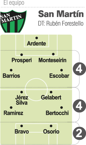 En el arco estará el capitán Luis Ardente, quien estuvo en algún momento de esta pretemporada muy cerca de irse a Colón de Santa Fe pero finalmente se quedó en San Juan sabiendo que es clave para San Martín. En la defensa, sin Mattia lesionado y sin Arian Pucheta suspendido por dos fechas, Forestello armó la zaga central con Gonzalo Prósperi como primer central más Monteseirín. Por los laterales, se produciría el debut absoluto del ex All Boys Rafael Barrios como lateral derecho mientras que Ian Escobar seguirá por la izquierda. En el mediocampo, el que se adueñó de la posición es Luis Jérez Silva que desde que llegó desde Dorados de Sinaloa estará junto a Marcos Gelabert por el centro del mediocampo, mientras que por la derecha irá Julio Ramírez en reemplazo de Marcos Fernández quien había sido fija en el esquema de Forestello en toda la pretemporada. Mientras que por la izquierda, la opción final es la de Nico Bertocchi que le terminó ganando la pulseada a Cristian Barinaga.