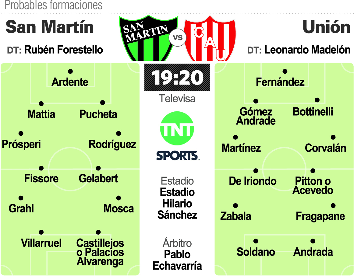 El "Verdinegro" cayó el sábado en zona de descenso por obra y gracia de su homónimo tucumano, que dirigido por su ex DT, Walter Coyette, ganó el clásico tucumano de manera heroica y salió del descenso mandándolo allí al conjunto sanjuanino. Por todo eso para San Martín será clave salir victorioso hoy. Enfrente tendrá a Unión, que suma 19 unidades en el campeonato y se sitúan en la novena ubicación, mientras que el Verdinegro está antepenúltimo con 11 puntos. Claro que esta última no es la gran preocupación de los dirigidos por el "Yagui" Forestello, sino el 1,115 que figura en la tabla de los promedios y que los ubica como el primero del cuarteto de equipos que perderán la categoría al término de la temporada.