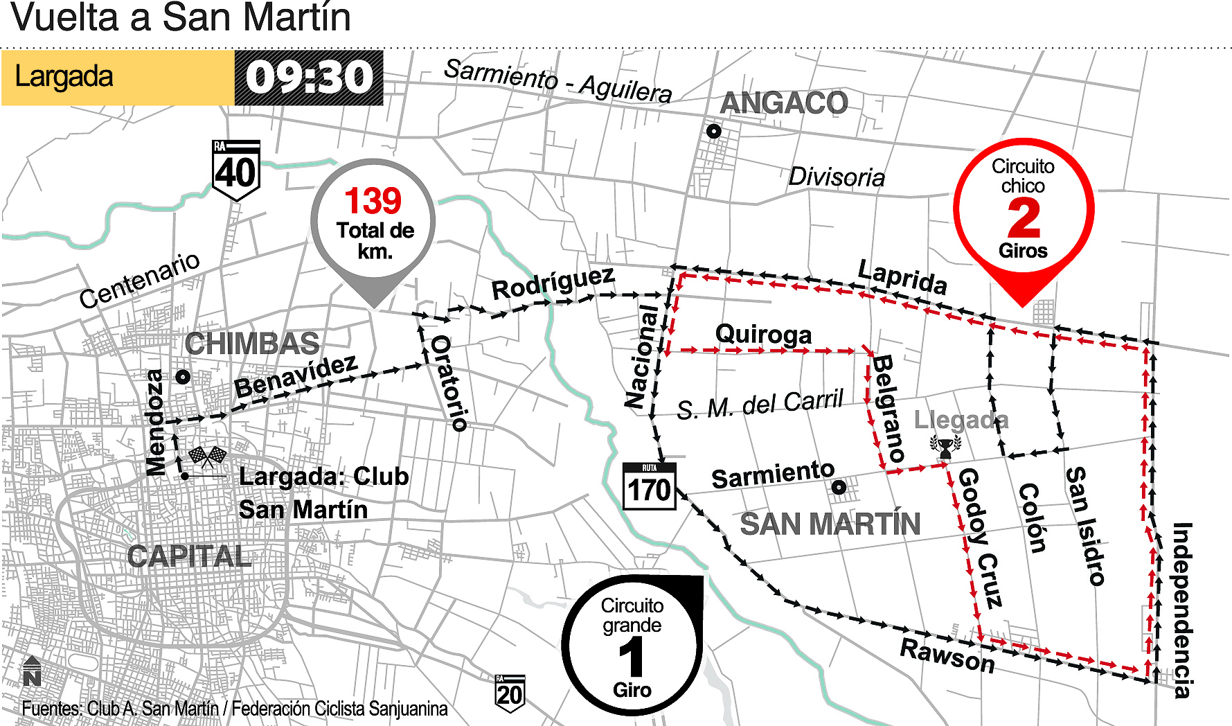 Como es habitual, la carrera se pondrá en marcha desde las puertas del estadio "Hilario Sánchez" en Concepción para luego atravesar Chimbas y llegar a San Martín. Tal cual se muestra en la infografía, partiendo desde las puertas del club de Concepción, el pelotón irá al Norte por Mendoza para girar a la derecha por Benavídez y viajar hasta Oratorio; luego girarán a la izquierda hasta empalmar con Rodríguez para partir al Este rumbo a calle Nacional. Allí se meterán de lleno en el corazón del departamento sanmartiniano, irán hasta Rawson y por esta hasta Independencia donde girarán a la izquierda y viajarán hasta Laprida para llegar nuevamente a Nacional, en ese punto comenzarán a transitar el "circuito chico" denominado así por los organizadores, que estará comprendido por las calles Quiroga – Belgrano -Sarmiento – Godoy Cruz – Rawson – Independencia – Laprida – Nacional. A ese trazado darán dos giros para totalizar casi 140 kilómetros y culminar en las puertas de la Municipalidad de San Martín donde se conocerá al ganador de la tercera fecha de la temporada. El último ganador de la Doble San Martín, disputada en marzo pasado, fue el mercedino Mauricio Quiroga, hoy ausente en el ciclismo sanjuanino.