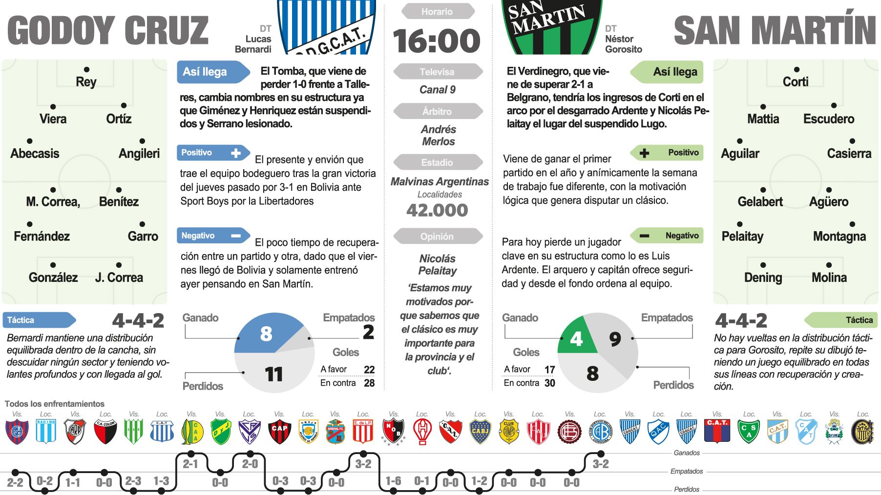 Porque San Martín viene de ganar su primer partido en el campeonato, que llegó frente a Belgrano (2-1) y recién en el séptimo juego con Pipo Gorosito al frente. Mientras que Godoy Cruz está en la doble competencia dado que el jueves jugó en Bolivia por la Copa Libertadores y superó 3-1 a Sport Boys, aunque sin sacarse de la cabeza el clásico cuyano que tendrá su edición 42 y el noveno partido en Primera División.