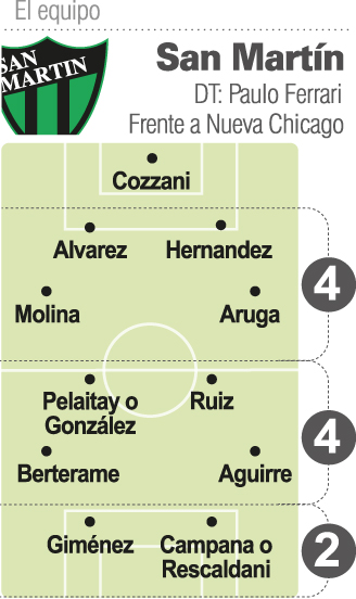 De no mediar imprevistos, para jugar mañana contra el Torito de Mataderos, San Martín tendría a Juan Cozzani en el arco, uno de los debutantes con la camiseta Verdinegra. En la defensa, tres de los cuatro serán debutantes: Nicolás Molina, como lateral derecho, Gastón Hernández como segundo central y Martín Aruga como lateral izquierdo, solamente será ya un conocido el sanjuanino Fransico Alvarez como primer central.
