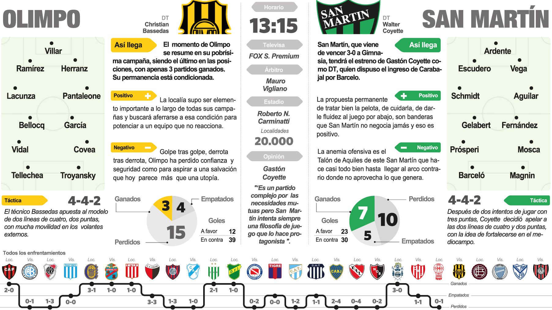 Enfrente estarán las necesidades de Olimpo que en el puesto 26 de promedios y cerrando las posiciones con apenas 3 partidos ganados en 22 disputados, sabe que está al borde del abismo. El entrenador Christian Bassedas hizo ya todo lo que pudo con el plantel que tiene pero su destino parece ya inexorable. Hoy, de no ganar podría quedar condenado al regreso a la Primera B Nacional. Su margen de maniobra es más que corto, no tiene opciones y ante San Martín saldrá a buscar los puntos que perdió mucho antes. Ese planteo puede que juegue a favor de este San Martín que pregona un estilo de buen trato y r espeto por la pelota pero que adolece de esa contundencia que hace ganar partidos.
