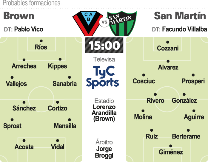 Pasó ya la frustración. Esa impotencia de ver cómo un error arbitral lo privó de volver a ganar en San Juan es pasado y para el Atlético San Martín el objetivo hoy es festejar en Adrogué cuando visite desde las 15 a Brown, por la fecha 20 dentro de la Zona B de la Primera Nacional. Nada más, ni nada menos. Con esa motivación, el equipo de Villalba tratará de repetir la buena producción que ya insinuó en los partidos contra Rafaela y contra Brown de Madryn, pero con la necesidad de concretar en goles todo lo que insinúa. En los nombres, el Verdinegro no cambiaría sistema ni nombres, sosteniendo la línea defensiva que se transforma en línea de tres o de cinco según lo necesite, más la solvencia de los dos volantes de contención, la creatividad de Pablo Ruiz como enlace y la movilidad de los dos puntas: Berterame y Giménez, en versión goleadora.