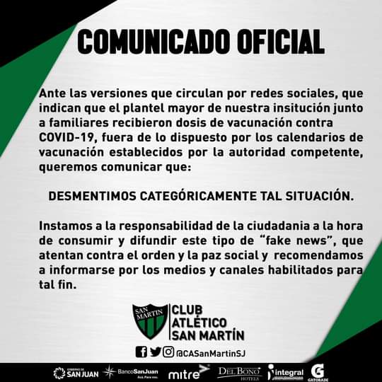 Cuando parecía que todo quedaba en un comentario de redes sociales, algunos jugadores del Verdinegro salieron a desmentir que eso sea verdad. El joven delantero Matías Giménez escribió, "soy jugador de San Martín y no nos han vacunados a ninguno, menos a los familiares". La versión que se disparó en Twitter incluía al plantel de Sportivo Desamparados.