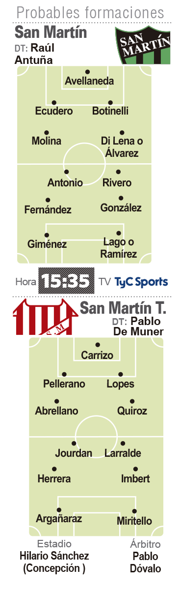 Enfrente estará el San Martín de Pablo De Muner. Un equipo que sostuvo el paso de Belgrano en algún momento de la temporada pero al que las lesiones y las ausencias le han quitado frescura y poder ganador. Viene de empatar sin goles contra Atlanta en La Ciudadela tucumana y en la previa de ese juego, perdió al arquero Oscar Sand quien se rompió ligamentos cruzados. El juvenil Nicolás Carrizo será su reemplazo, en su segundo partido como titular absoluto. La otra baja es el lateral Diarte -desgarrado-, jugando en su lugar Franco Quiroz. En tanto que en los regresos, volverá a contar con Hernán Pellerano en la zaga, mientras que Tomas Costa y Marcos Llama -ya recuperados- estarían entre los suplentes. El Santo tucumano hace 12 fechas que no pierde y eso lo sostiene entre los protagonistas.
