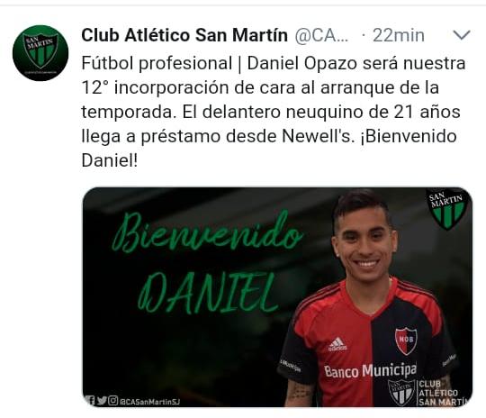 Luego de cerrar el pase, el equipo sanjuanino le dio la bienvenida a Opazo en las redes sociales.