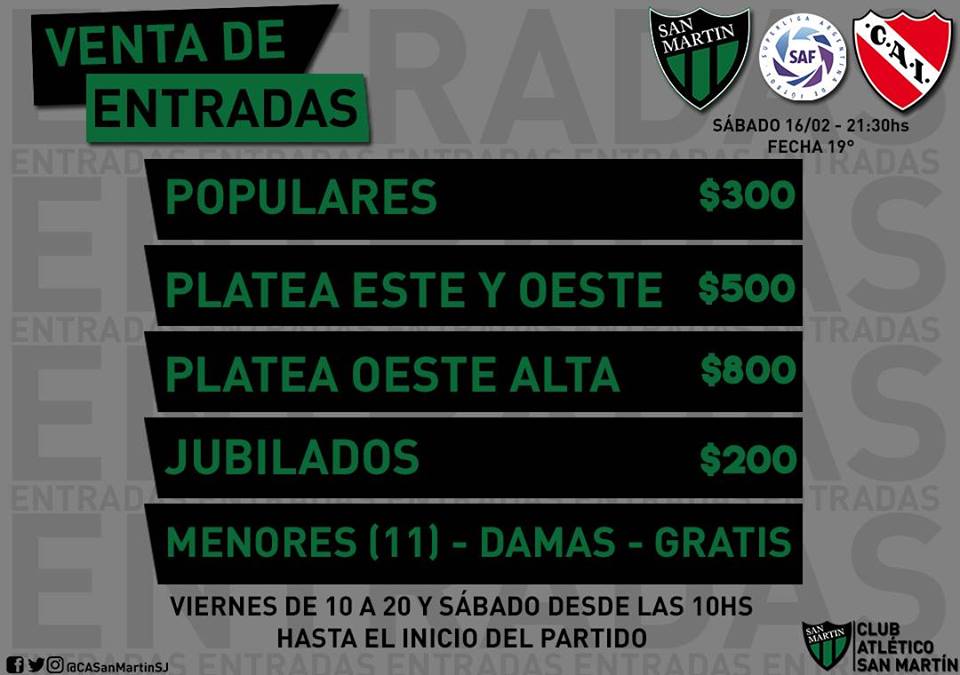 El Club Atlético San Martín informó este miércoles el detalle con los precios de las entradas para el partido que el Verdinegro recibirá en el Hilario Sánchez a Independiente, previsto para este sábado a las 21:30.