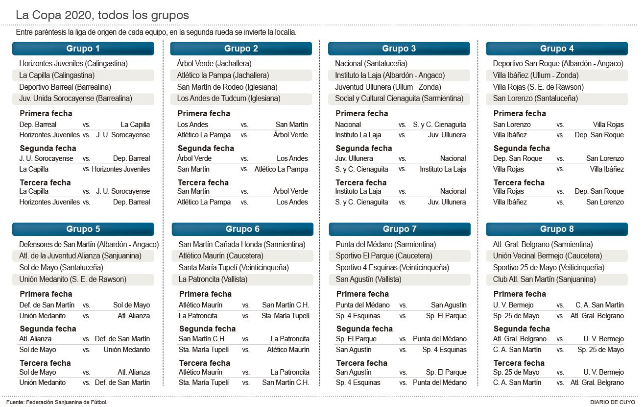Se podría decir que la Copa de Campeones 2020 ya comenzó. Y es que luego de confirmarse la presencia de Atlético de la Juventud Alianza y del Atlético San Martín -ambos de la Liga Sanjuanina- la última plaza vacante quedó en manos de Atlético Cieneguita de Sarmiento que confirmó presencia y estará jugando su tercera copa desde que se afilió a la liga sureña. Con todo esto, la Federación Sanjuanina terminó de armar el cuadro de los 8 grupos, reunidos por proximidad geográfica. Así, en el Grupo 1 quedaron incluidos los equipos de Calingasta y Barreal, quienes jugarán las seis fechas de la fase clasificatoria para darle nombre a los dos clasificados de ese grupo. En el Grupo 2 están los iglesianos y los jachalleros con una promesa de enorme paridad en esa zona por la calidad de los que están ya que San Martín de Rodeo es el actual campeón y Los Andes de Tudcum ganó en 2018. En el Grupo 3 se anotan Instituto de Albardón, Juventud Ullunera, Nacional de Santa Lucía y Cieneguita de Sarmiento. Para el Grupo 4 quedaron San Roque de Albardón, Villa Ibañez de Ullum, San Lorenzo de Santa Lucía y el debutante Villa Rojas de la Liga Sureste de Rawson. En el Grupo 5 aparece uno de los grandes: Atlético Alianza. El Lechuzo compartirá grupo con Defensores de San Martín de la Villa Mariano Moreno, Sol de Mayo de Santa Lucía y Unión Medanito de Rawson.