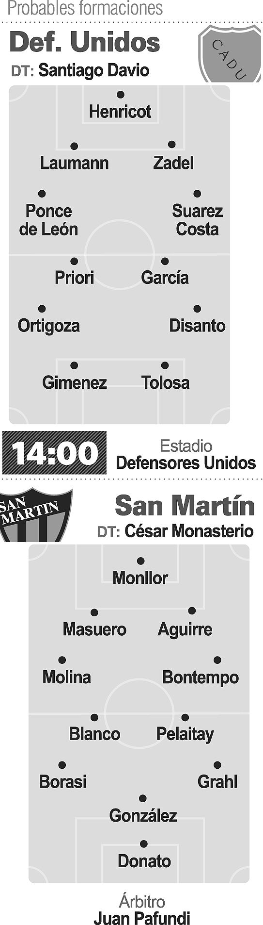En los nombres, la vuelta de Bontempo en el lateral izquierdo es casi un hecho. Iría por Álvarez en la línea de fondo que completan Molina, Masuero y Aguirre. En el medio, Monasterio terminará de decidir pero el regreso de Pelaitay para la marca es clave más de visitante, por lo que Nico iría por Ludueña de perfil más ofensivo. Blanco sería el otro volante de contención, retrasando a Borasi a la derecha y abriendo a Grahl por izquierda. Más arriba, Sebastián González iría suelto y Matías Donato sería el único atacante.