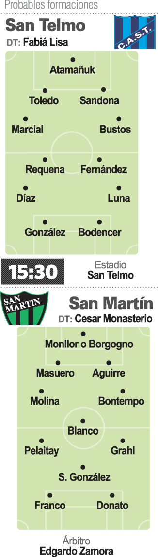 En la previa, la semana posterior al triunfo ante Temperley, para San Martín todo estuvo marcado por la incertidumbre. Las secuelas físicas le pasaron factura y el técnico Monasterio tuvo que esperar hasta último momento para poder decidirse por su formación. El caso más emblemático fue el del arquero Mariano Monllor que estuvo en duda pero estaría en el arco pese a no estar en todo su potencial físico. El resto, con algunos retoques en los nombres con la probable vuelta de Augusto Aguirre a la zaga central reemplazando a Sienra, mientras que el sistema táctico no se tocará para nada: cuatro atrás, tres en el medio, enganche y dos puntas. En los nombres, Molina, Masuero, Aguirre y Bontempo, en el fondo; Pelaitay, Blanco, Grahl en el medio, Sebastián González libre y de puntas, Nico Franco y Matías Donato. Enfrente estará el pobre presente de San Telmo que viene de perder ante Defensores Unidos en la fecha pasada. Apenas ganó dos partidos, tiene sólo 8 puntos y hoy está perdiendo la categoría. Fabián Lisa decidió salir, pero hoy estará al frente del equipo por última vez. En los nombres, aparecen Damián Toledo y Juan Requena -ex San Martín- son los que sobresalen. Pero claro, no le sobra nada y sus urgencias son muchas. Eso, pese a la crisis, lo hace un rival para respetarlo. San Martín sabe que en la previa, tiene una sola misión: ganar. Pero en la Primera Nacional, todo es tan parejo que muchas veces, el que se confía, lo lamenta después.