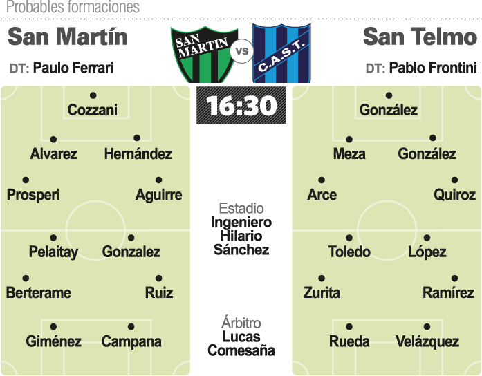 Con algunos cambios y con el ánimo retemplado por el enorme partido de Copa Argentina contra Racing, San Martín tratará de ser otra vez fuerte en su cancha. Viene de empatarle a Villa Dálmine el sábado pasado y ese punto conseguido con el golazo de tiro libre de Pablo Ruiz, sólo tendrá valor si hoy suma de a tres puntos. En lo futbolístico y con el regreso de Gonzalo Berterame, para el técnico verdinegro el esquema se vuelve a consolidar con el vértigo que le pone el ex San Lorenzo por la derecha, mientras que Ruiz por el otro costado es el dueño de la pelota. La pareja de volantes centrales se vuelve a repetir con la vuelta de Nico Pelaitay para trabajar con Maxi González, mientras que en defensa la lesión de Alejandro Molina contra Racing le abrió una opción de Gonzalo Prósperi. Arriba, la combinación ofensiva tiene varias opciones pero todo indica que Ferrari apostaría por la dupla Giménez-Campana para el arranque.