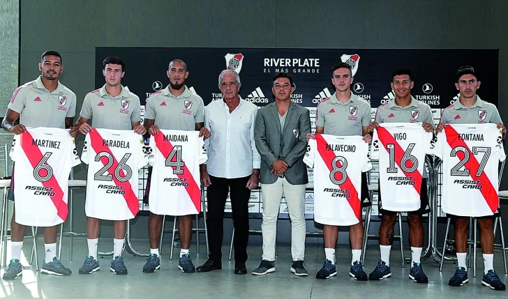 Los seis jugadores mostraron las camisetas con los números que tendrán: Jonatan Maidana (4), David Martínez (6), Agustín Palavecino (8), Alex Vigo (16), José Paradela (26) y Agustín Fontana (27).
