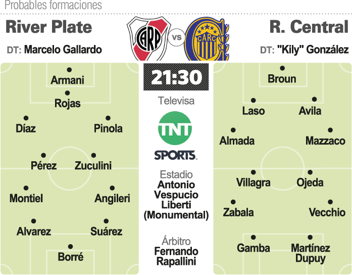 River Plate recibirá hoy a Rosario Central, en un partido válido por la segunda fecha del Grupo A que tendrá como novedad el regreso del equipo de Núñez a su estadio "Monumental" después de casi un año en el que fue refaccionado.