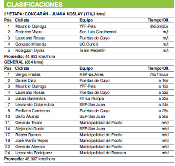 El bonaerense Sergio Fredes (KTM) continúa al tope de las posiciones generales con Daniel Díaz (Puertas de Cuyo) a cuatro segundos. Este viernes se corre la contrarreloj, por lo que el salteño que defiende la camiseta del equipo continental sanjuanino tiene grandes chances de arrebatarle la malla de líder al corredor oriundo de la localidad de Ranchos.