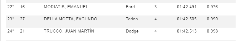 Por su parte, el sanjuanino Facundo Della Motta con su Torino partirá desde la 12da grilla, ya que marcó 1m42s505, casi un segundo más que el mendocino.