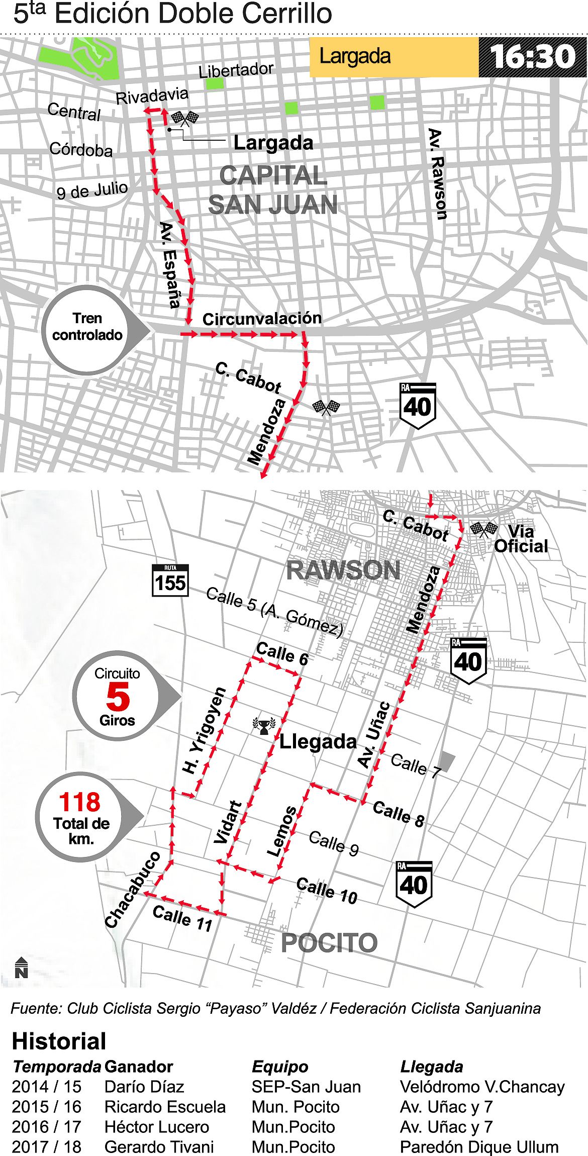 Tras seis meses de sequía federada, las rutas sanjuaninas volverán hoy a vestirse con los colores de las casacas de todos los equipos que participarán de una nueva temporada del ciclismo sanjuanino. La quinta edición de la "Doble Cerrillo", carrera que organiza el Club Sergio "Payaso" Valdéz y fiscaliza la Federación Ciclista Sanjuanina, tendrá esta tarde una versión distinta. Por primera vez en su corta historia federada, porque entre los libres se trata de una carrera clásica, la competencia no llegará al promontorio que marca el límite entre los Departamentos sureños, Pocito y Sarmiento.