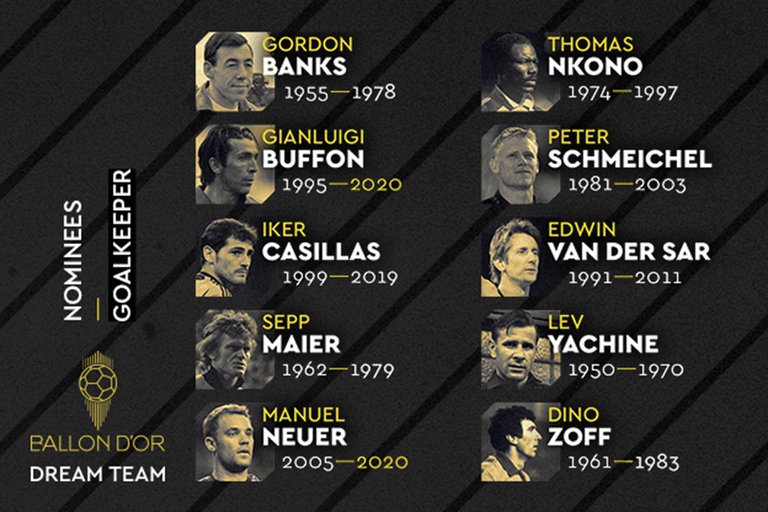 Gordon Banks, Gianluigi Buffon, Iker Casillas, Sepp Maier, Manuel Neuer, Tommy N’Kono, Peter Schmeichel, Edwin van der Sar, Lev Yashin y Dino Zoff son los diez arqueros que pelean por un puesto en el Balón de Oro Dream Team.