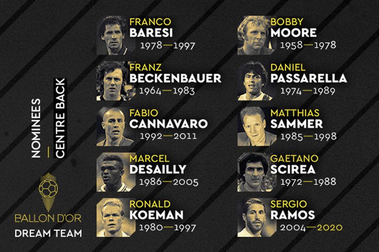 Entre los centrales se han seleccionado los nombres de: Franco Baresi, Franz Beckenbauer, Fabio Cannavaro, Marcel Desailly, Ronald Koeman, Bobby Moore, Daniel Passarella, Matthias Sammer, Gaetano Scirea y Sergio Ramos.