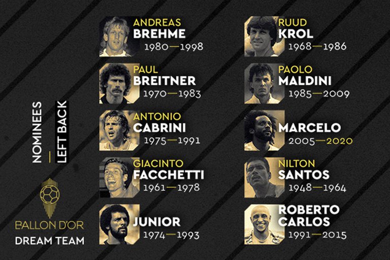 Finalmente, los candidatos en la zona del lateral izquierdo son: Andreas Brehme, Paul Breitner, Antonio Cabrini, Giacinto Facchetti, Junior, Ruud Krol, Paolo Maldini, Marcelo, Nilton Santos y Roberto Carlos.
