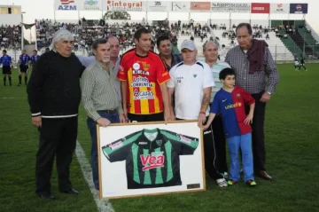 Antes del inicio del encuentro, recibió una plaqueta por parte de la hinchada verdinegra y después fue el tiempo para que los dirigentes le entregaran una réplica de la camiseta número nueve con la cual hizo aquella jugada histórica ante el Globo para llegar a Primera en el 2007.