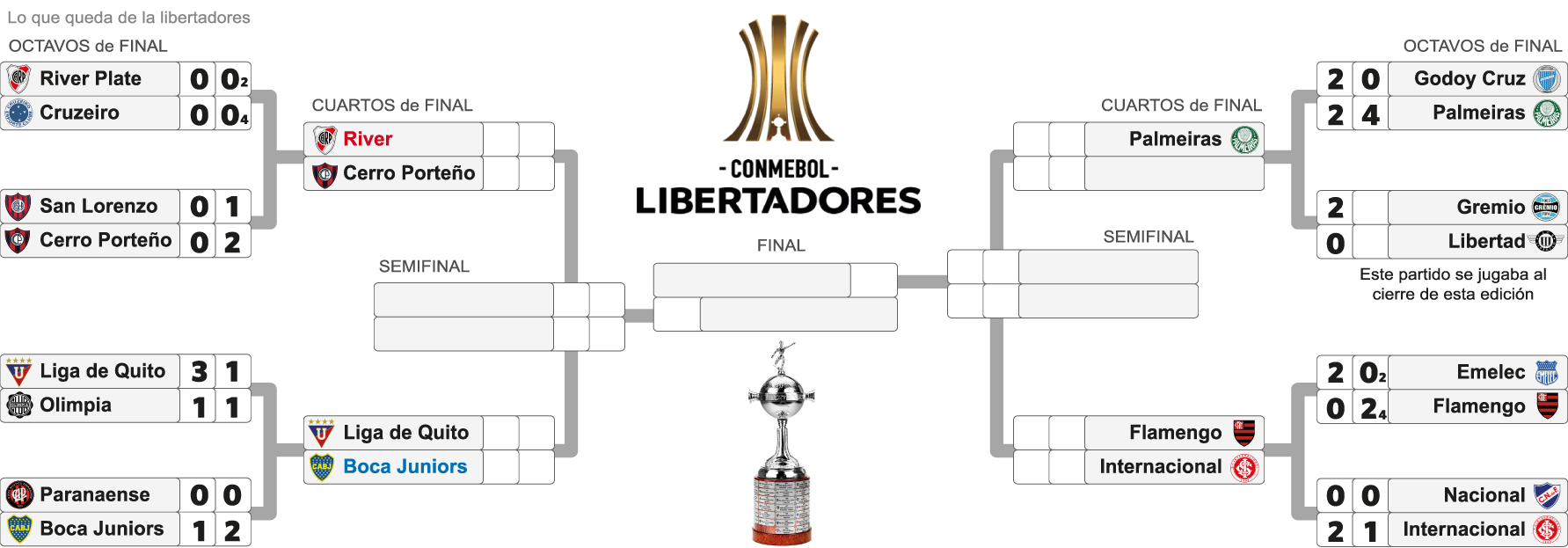 La primera mirada es clara: estamos a una serie de otro River-Boca en la Copa Libertadores. Como la serie del año pasado, con escándalo incluido, que definió el torneo en Madrid, España, para el Millonario. Pero no sólo eso quedaría establecido luego de los cuartos de final, sino que al proyectar el cuadro de cada lado se nota claramente como una final con clásico sudamericano entre un equipo argentino y otro sudamericano es más que probable. Sobre todo del lado de los brasileños, ya que ya hay tres clasificados por ese sector y anoche Gremio podía sellar ese póker para asegurar ese país un finalista de esta edición.
