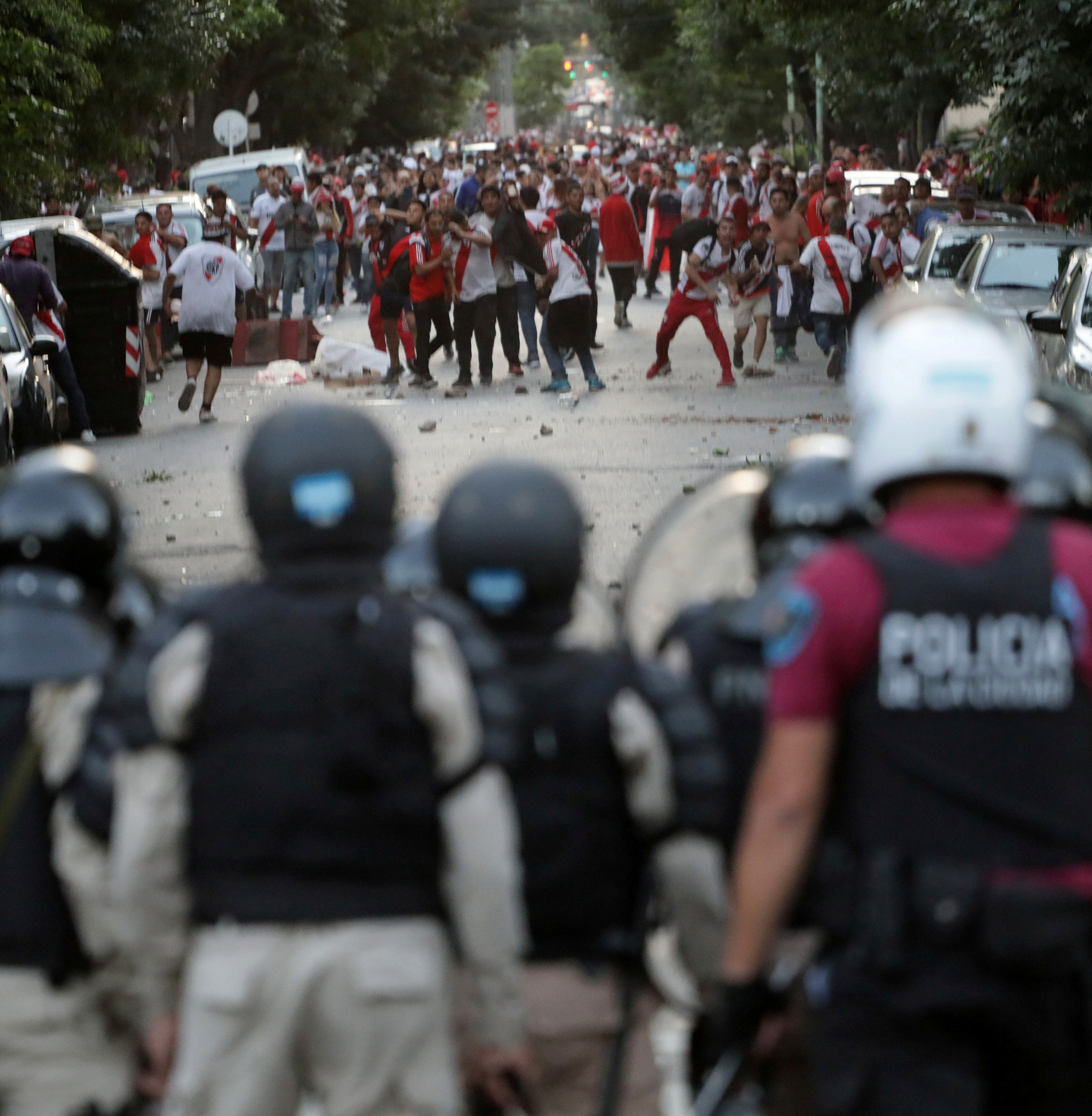 El colectivo de Boca fue atacado por hinchas de River, que lanzaron piedras y objetos que causaron heridas en algunos jugadores. La Policía empleó gases para dispersar a los agresores y futbolistas de Boca necesitaron atención médica. La Conmebol retrasó en dos ocasiones el comienzo del partido y después decidió aplazarlo 24 horas; a la vez que se producen incidentes, robos y destrozos en las inmediaciones del estadio.