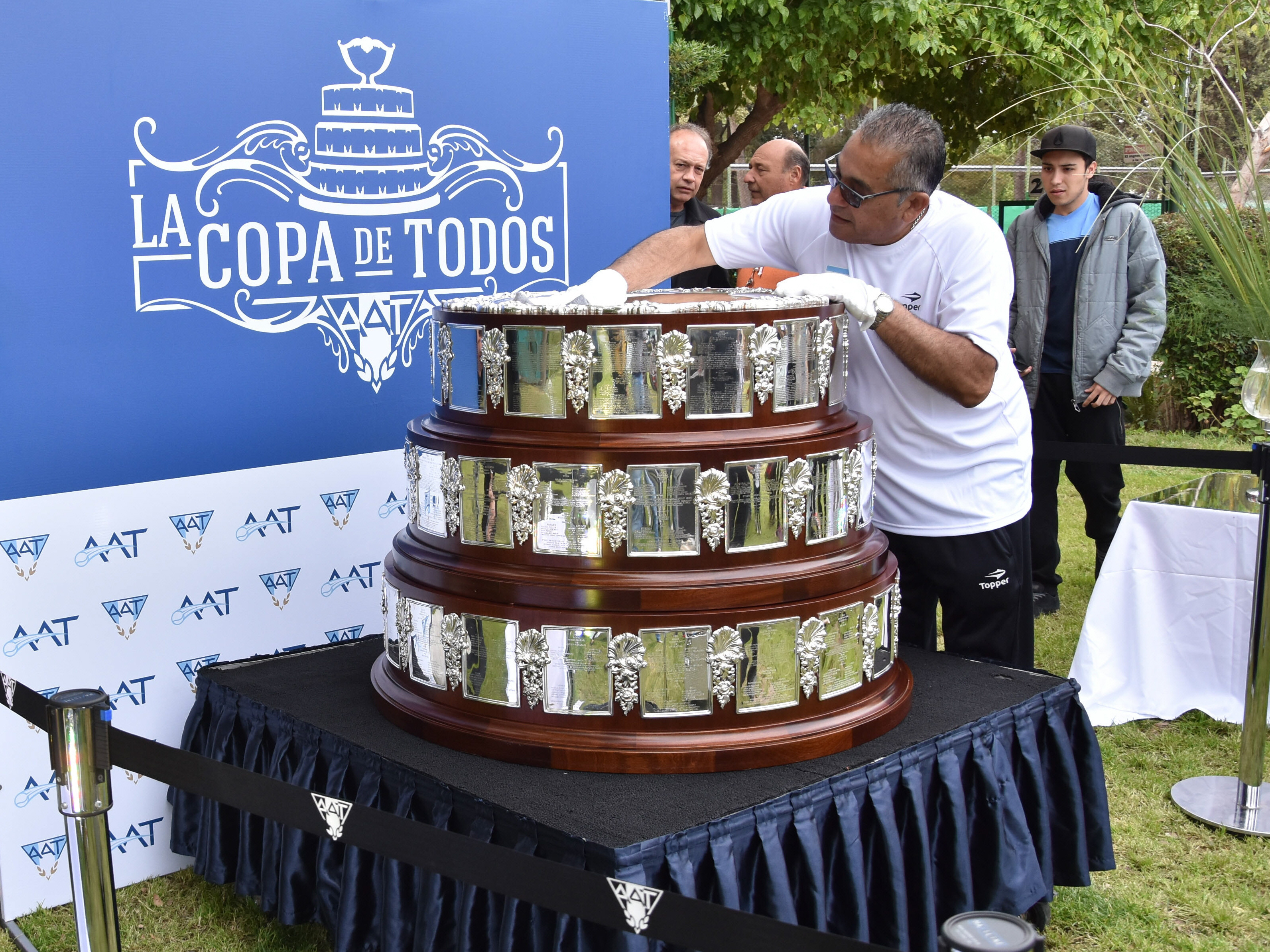 Cuatro contenedores, todos cerrados con candado, un particular procedimiento para montar toda la estructura, que pesa 105 kilos y mide 110 centímetros, guantes blancos para manipularlo y guardias de seguridad (con saco y corbata) custodiando todo el tiempo. La Ensaladera de Plata, el trofeo de la Copa Davis que ganó el equipo argentino a fines del año pasado, llegó ayer a San Juan para ser exhibida y DIARIO DE CUYO fue testigo del llamativo protocolo para montarla en los jardines del San Juan Lawn Tennis. Y es que la copa, que deberá ser devuelta antes de la próxima final del torneo, puede ser observada, admirada y fotografiada pero no tocada, ya que eso puede hacerlo solamente la persona designada por la Asociación Argentina de Tenis (AAT); quien además es el encargado de trasladarla por el país.
