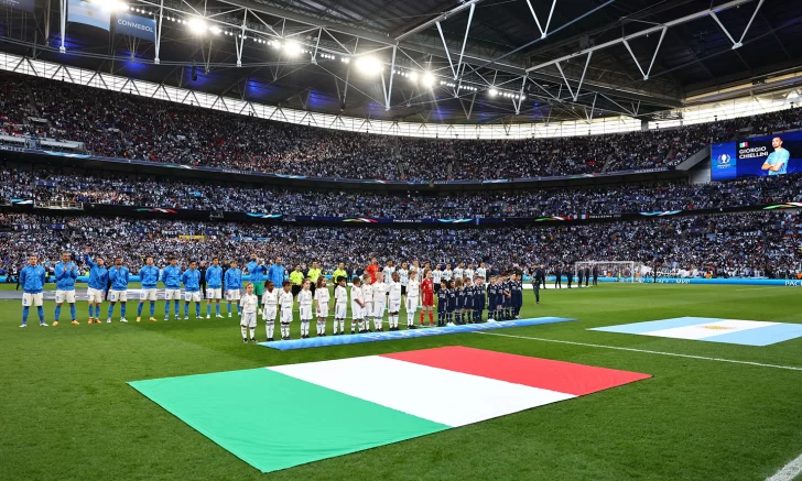 El legendario estadio estuvo colmado con sus más de 90.000 localidades vendidas. De ellas, cerca de 10.000 resultaron hinchas argentinos que se acercaron para observar en vivo y directo una victoria histórica. "El que no salta es un inglés", fue una de las canciones que entonaron una vez consumada la goleada sobre la Azzurra. Además de los hits, también se observaron en las tribunas diversas banderas recordando a Diego Maradona. Incluso, en algunas de ellas se mostraba al Pelusa "junto" a Messi.