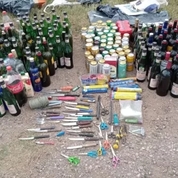 En el operativo, hasta el momento, se secuestraron de diversos elementos como pirotecnia, bebidas alcohólicas y armas blancas, detallaron las fuentes. Según se puede apreciar en las fotos, se trata, en su mayoría, de botellas de fernet, latas de cerveza, cuchillos y tijeras. También hay algunas herramientas como una pinza, un destornillador, sacacorchos y algún encendedor.