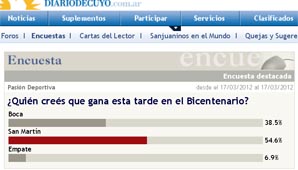 Al respecto, DIARIO DE CUYO ONLINE publicó una encuesta con la siguiente consigna Quién creés que gana esta tarde en el Bicentenario? Las opciones fueron gana Boca, se impone San Martín o hay empate.
