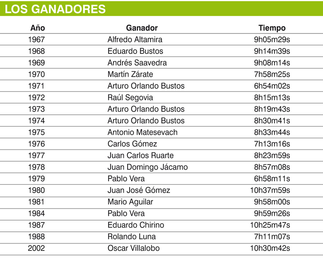 Alfredo Altamira ganó la primera edición de la Doble Jáchal en 1967, desde allí hasta 1988 con algunos baches la prueba tuvo continuidad (ver aparte), siendo el popular Cacho (Arturo Orlando) Bustos, quien más veces la ganó, en tres ocasiones.