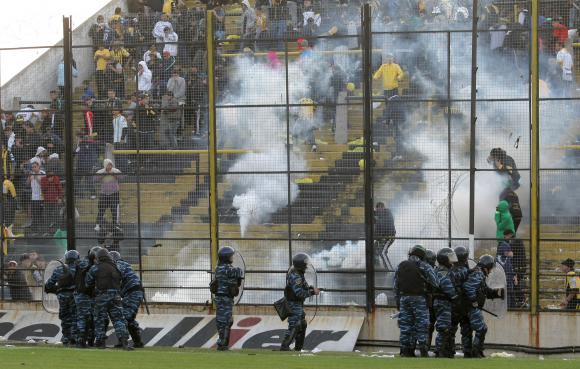 Cinco hinchas detenidos, enfrentamientos con la policía, gases lacrimógenos y el entrenador y el masajista de Huracán golpeados fue el resultado de la violencia que volvió a disparar las barras de Almirante Brown.