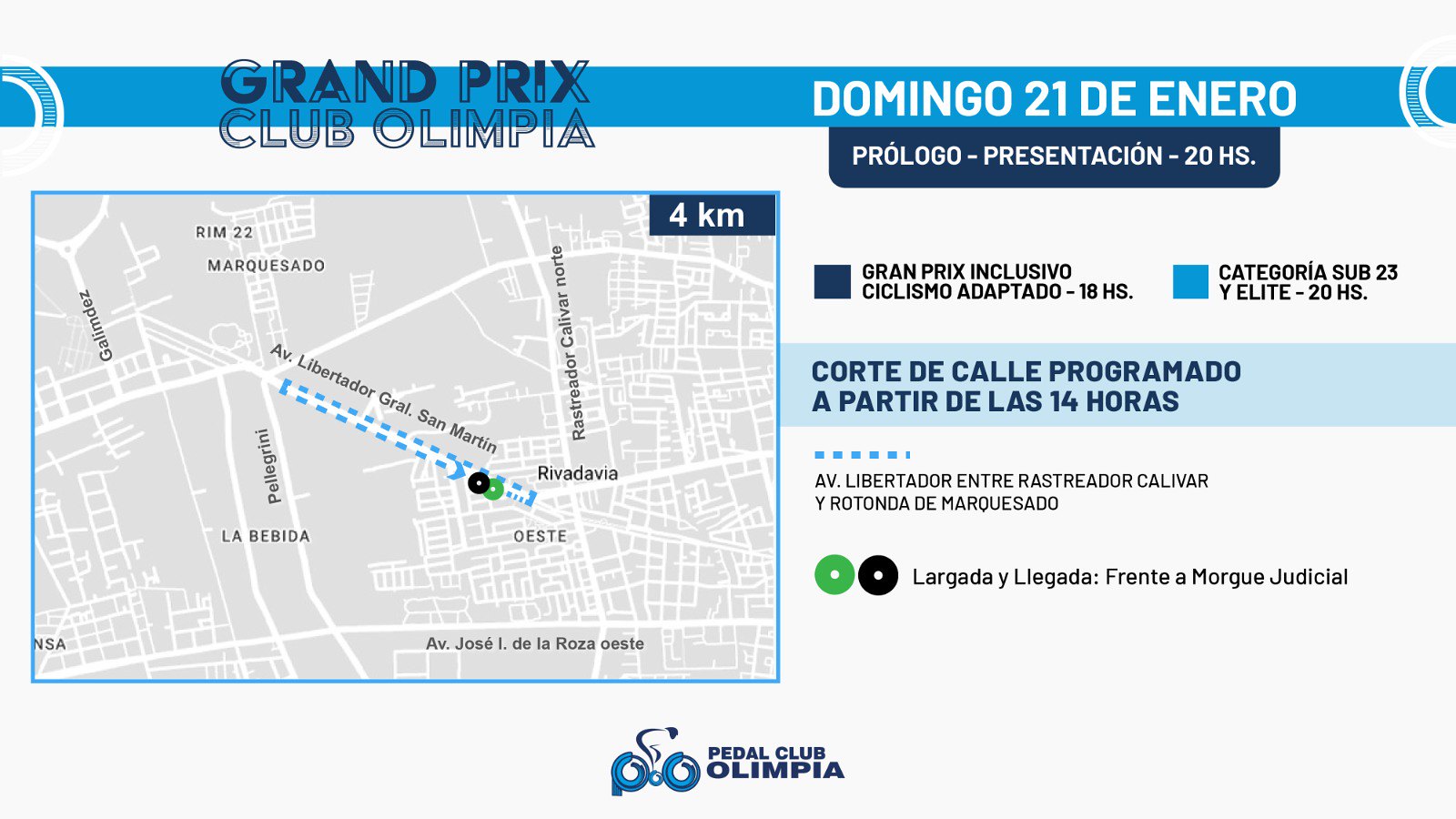 Este domingo en la noche, se desarrollará el prólogo del Gran Prix de Olimpia, el nombre que reemplaza la tradicional Vuelta a San Juan. Desde la organización de la carrera de ciclismo informaron los horarios y los cortes de calles que habrá en la presentación de la competencia.