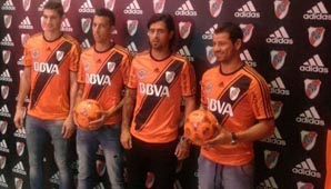 Lucas Alario, Leonardo Pisculichi, Rodrigo Mora y Leonel Vangioni fueron los modelos que lucieron la camiseta con fondo naranja y la franja negra, con un distintitvo en el pecho izquierdo que tiene la pelota anaranjada como a la que ‘Beto‘ Alonso le sacó lustre aquella tarde del 6 de abril de 1986 al convertir los dos goles.
