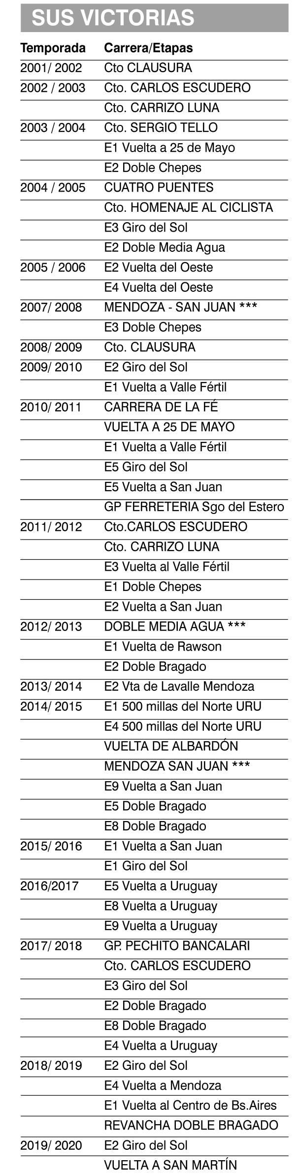 Su primera victoria fue en marzo de 2002, en el Circuito Clausura, y de allí en más se sucedieron más de medio centenar de triunfos con tres clásicas. Dos veces la Mendoza-San Juan y una la Doble Media Agua.