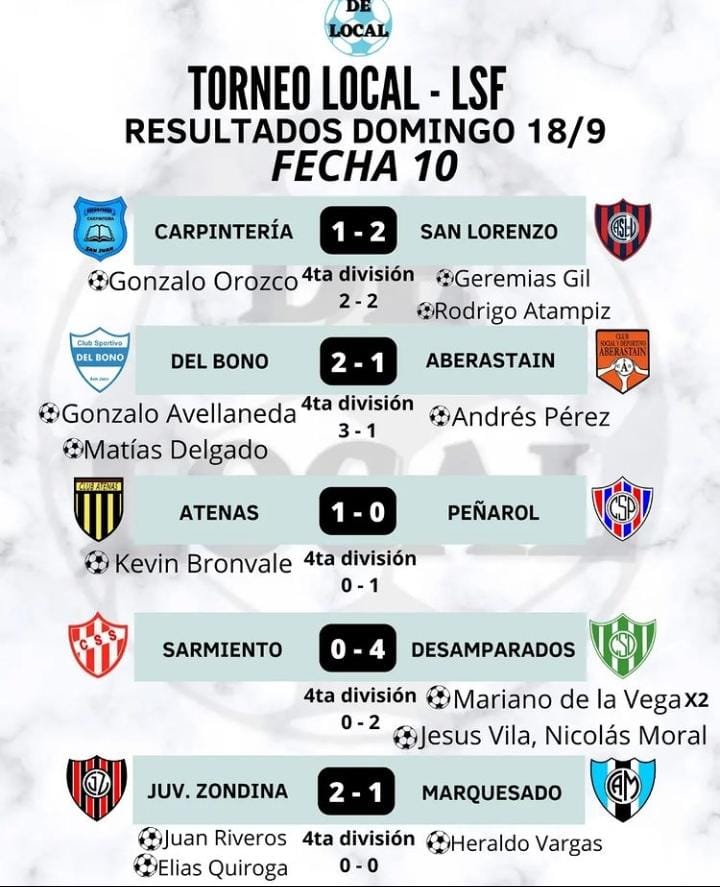 Durante el domingo se disputaron cuatro partidos pertenecientes a la 10ma fecha del Torneo Local. San Lorenzo, Del Bono Atenas, Desamparados y Juventud Zondina fueron los equipos que sumaron una victoria.