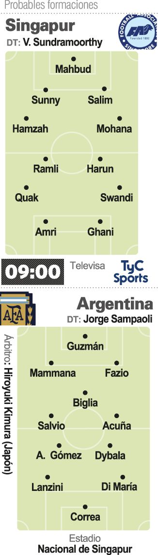 A repetir. La Selección argentina largó la “Era Sampaoli” con un triunfo ante Brasil. Para hoy, ante Singapur, cambió todo el equipo y buscará golear para seguir afirmándose como grupo y como equipo.