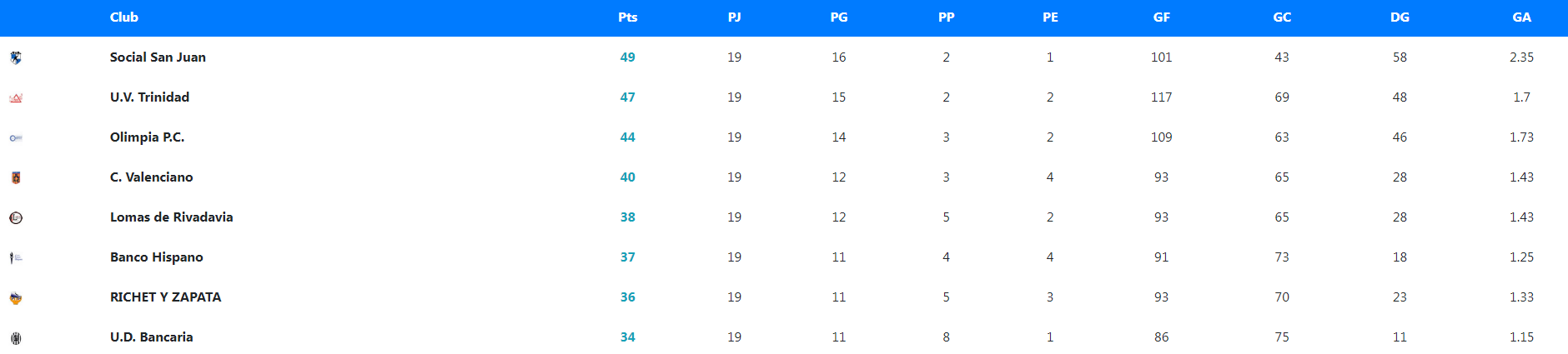 El Decano derrotó por un ajustado 5-4 a Bancaria Sub 23 y cerró la tabla de posiciones con 49 puntos, producto de 16 victorias, un empate y dos derrotas en 19 juegos. Gran campaña. Lo siguió UVT dos puntos por debajo, que en la última fecha no tuvo piedad frente a Huarpes y le ganó 7-2 como vistante.