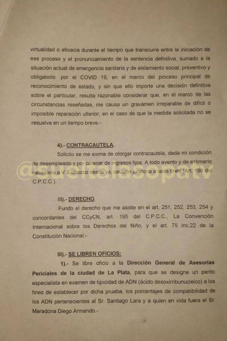 “Hasta los últimos días antes de su muerte, que se tenía que sacar el respirador para hablar, mi madre le dijo a un grupo de abogados que yo era hijo de Diego. Quiero saber quién soy. No tengo pretensiones económicas”, aseguró este viernes Santiago.