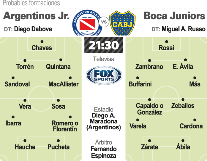 Hoy Boca jugará con una formación suplente con la presencia de algunos "ilustres" como Edwin Cardona, Ramón Ábila, Mauro Zárate y Julio Buffarini. Otro que dirá presente desde el inicio será el lateral izquierdo sanjuanino, Emmanuel Mas, quien ganó cierta continuidad en el torneo doméstico ya que el técnico priorizó el certamen continental. No obstante, no será el equipo que empató ante River de local 2-2 en la fecha pasada. Alan Varela, 19 años y de Isidro Casanova, será colocado en la media cancha por Russo, quien también habría decidido que Gastón Ávila, rosarino, zurdo, de 19 años, conforme la zaga con el peruano Carlos Zambrano.
