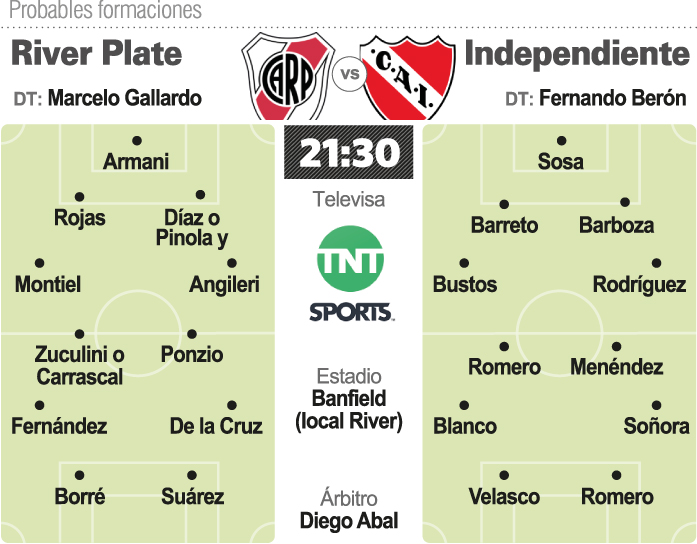 En cancha del Taladro, en el sur de Buenos Aires, Gallardo pondría en su River la mayoría de titulares, impulsado por una deuda: a diferencia de su prolongado éxito a nivel continental, y más allá de la Copa Argentina, no ganó torneos locales desde que se hizo cargo de River. Tuvo a mano la última edición de la Superliga y la perdió en la última jornada justamente a manos de Boca. El entrenador recuperó al lateral izquierdo Fabricio Angileri (superó un pequeño desgarro en el isquiotibial izquierdo), que le había ganado el puesto a Milton Casco, y podría reaparecer. En cambio no estará el volante Enzo Pérez, expulsado en el empate 2 a 2 con Boca en la Bombonera; y existen dudas sobre la presencia de Jorge Carrascal, que podría ser castigado por el DT por su infantil tarjeta roja ante Palmeiras.