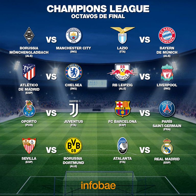 El RB Leipzig (GER) fue el cuarto equipo en conformar el cuadro y su serie quedó compuesta contra el Liverpool (ENG). Oporto (POR), en tanto, jugará ante la Juventus (ITA), mientras que el FC Barcelona (ESP) de Lionel Messi buscará los cuartos de final frente a París Saint-Germain (FRA).