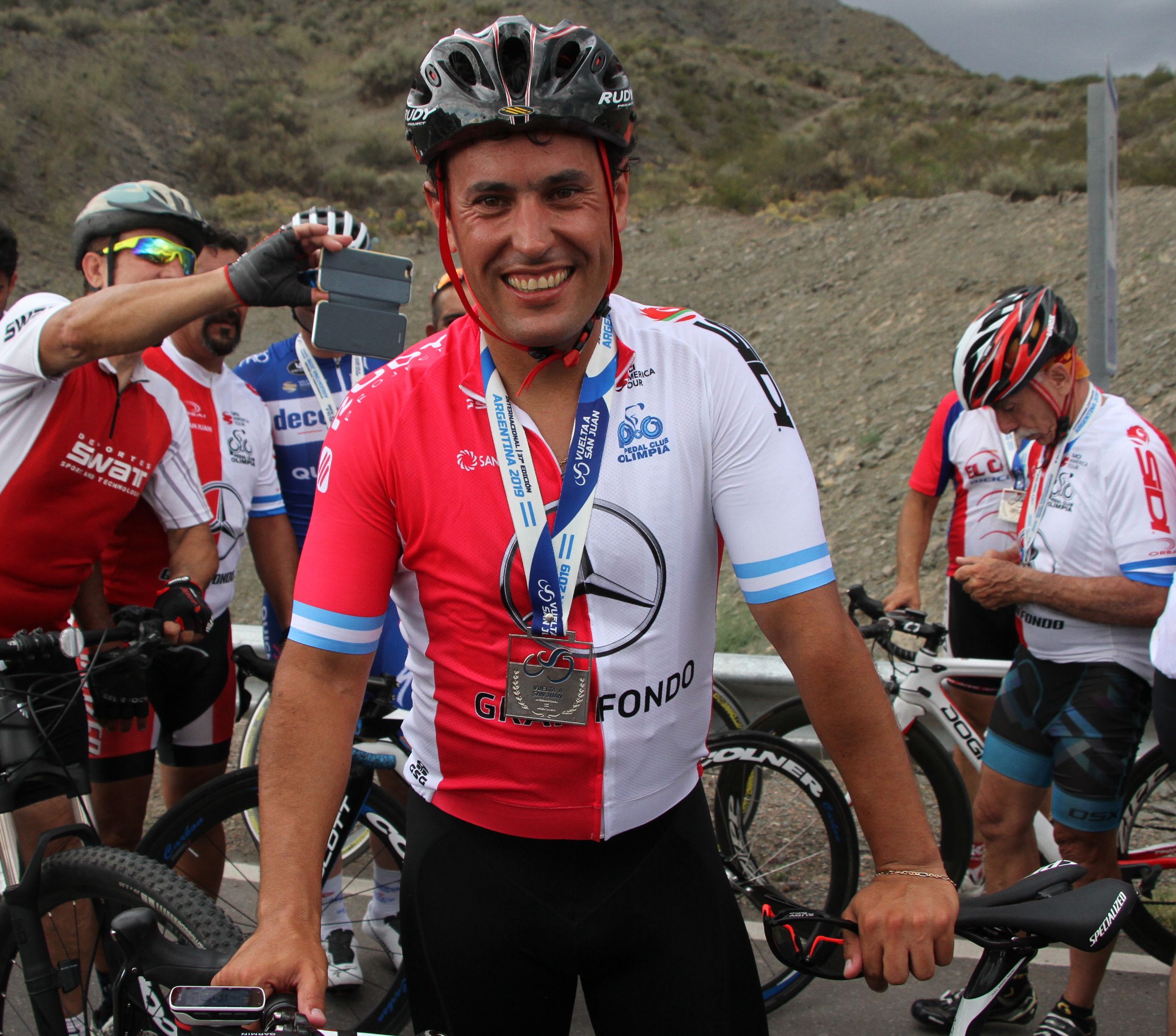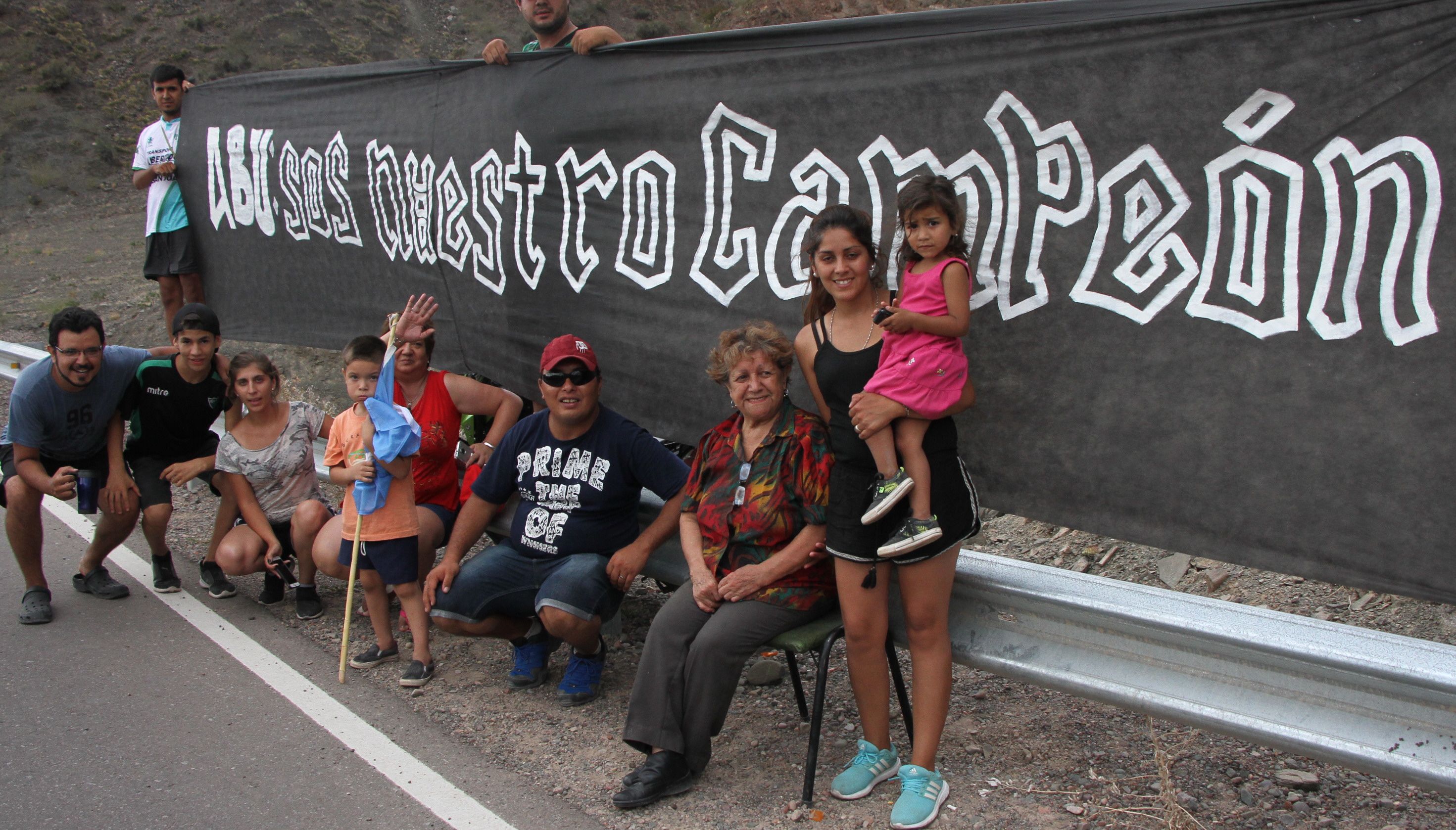 Era un gran anhelo para Jorge Pintos poder ser parte del Gran Fondo de la Vuelta a San Juan. El hombre, oriundo de Chimbas, compite actualmente en la temporada de Libres y se puso como meta disputar la prueba pero nunca se imaginó contar con hinchada. Su esposa, hijos y nietos lo sorprendieron con una bandera en el punto de meta que decía: "Abu sos nuestro campeón".
