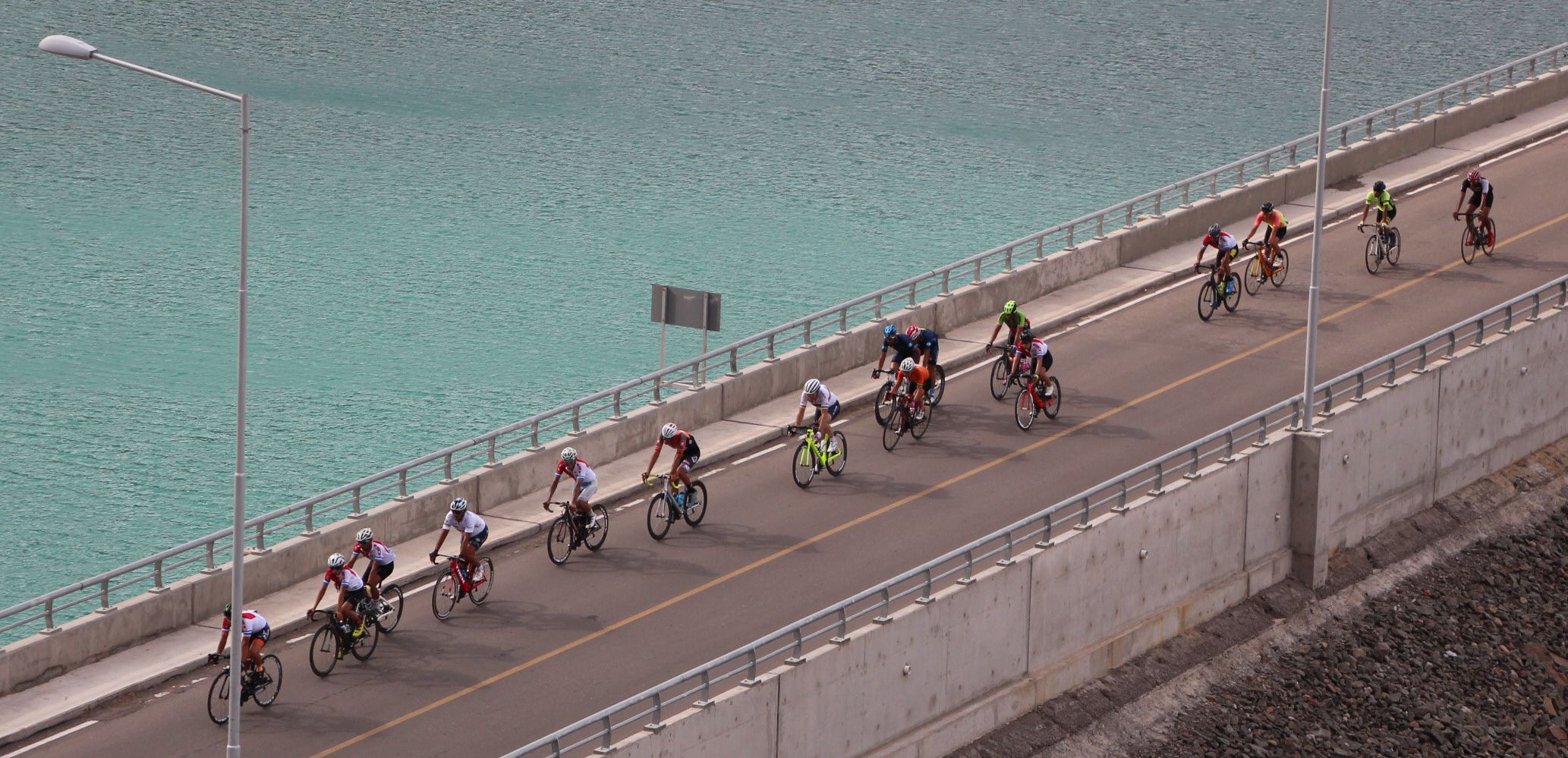 La dureza y la belleza… El paso del pelotón por el puente del dique Punta Negra ya trae a cuestas el desgaste propio que provoca el ascenso por la zona de los caracoles. Aunque claro, la belleza que le aporta el increíble paisaje que conforman el cerro y el lago le aporta el plus a quienes pasan por allí.</P>