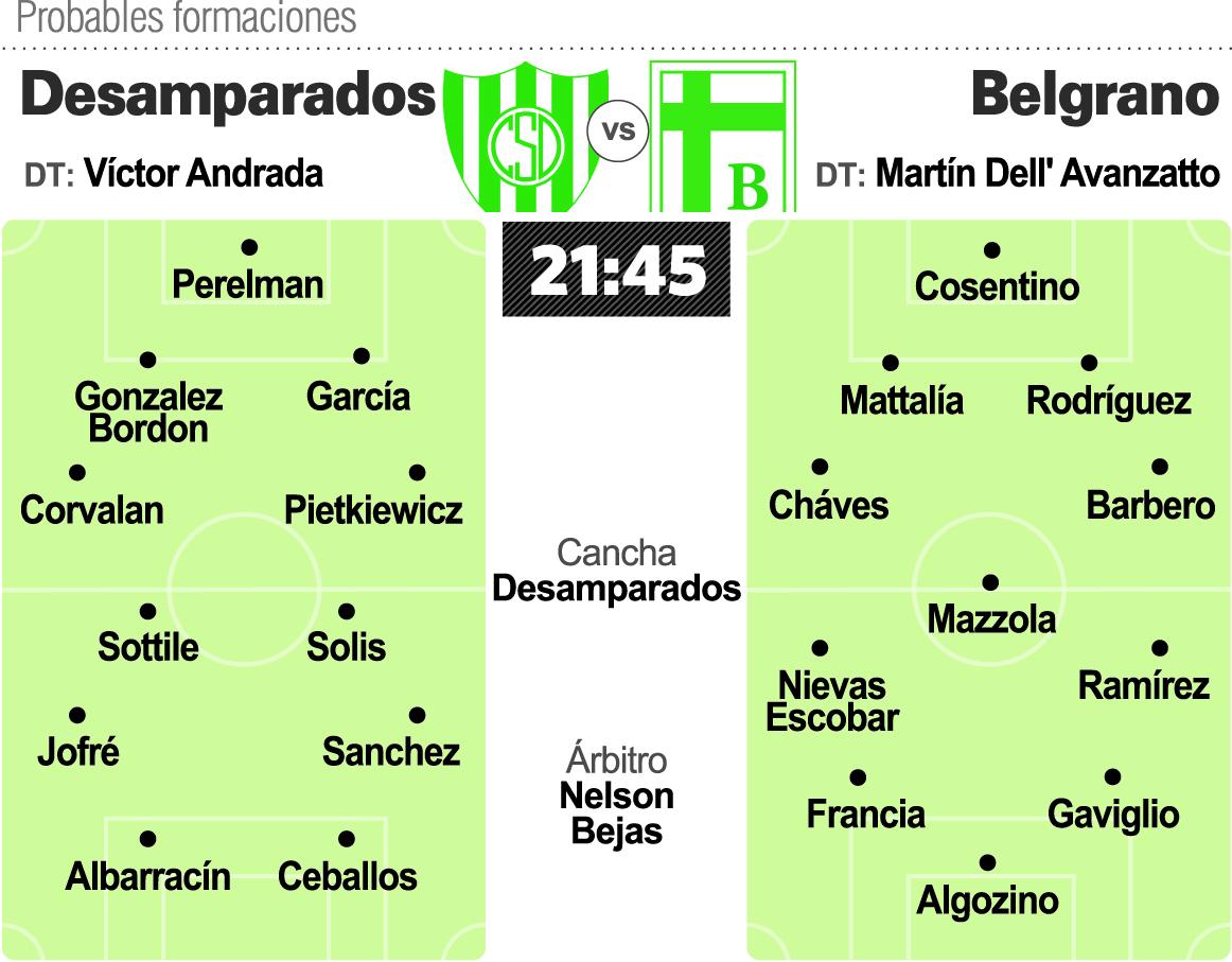 El momento es ideal en Puyuta. Haber conseguido ganarle a Huracán Las Heras en Mendoza sirvió para soltar presiones y demostrar que este Desamparados puede, pero el costo fue alto porque su goleador Jonathan Lastra se lesionó y se perderá el partido ante los cordobeses. Su reemplazo será Santiago Ceballos, de enorme momento en el torneo local y ansioso por tener la chance en el Federal A. El resto, igual a la formación que ganó en Las Heras, sabiendo que Andrada parece haber encontrado el equipo y apuesta a eso. En los números, el momento también invita a buscar la victoria porque con la caída de Maipú en Río Cuarto, Desamparados quedó a 4 unidades de la punta y ya cumplió con la fecha libre, por lo que ganando se acomodaría bien arriba. Enfrente tendrá a un Belgrano de San Francisco en plena transición. Es que se fue Edgardo Cervilla de su conducción técnica y recién cuando regrese de San Juan se pondrá al frente Cristian Domizzi, mientras lo conduce Martín Dell"Avanzatto quien ganó el primer partido de esta temporada el pasado domingo ante Racing de Córdoba. Entre los nombres conocidos que trae el Verde de San Francisco se anotan el talentoso Juan Pablo Francia y el delantero ex Unión de Rawson, Ezequiel Gaviglio.