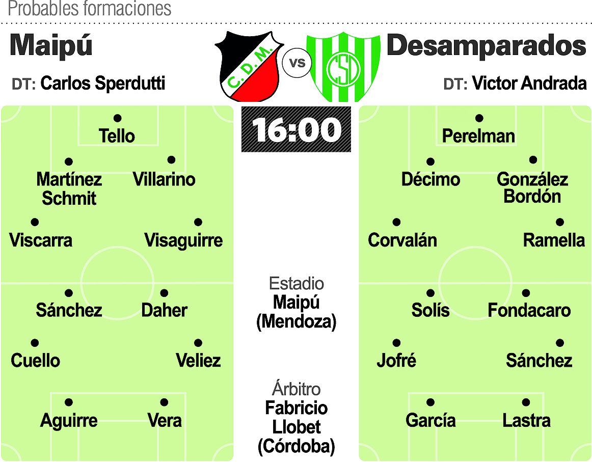 Hoy la historia es otra. Los dos saben que un paso en falso se paga caro y ninguno de los dos quiere desaprovechar la oportunidad de hoy. El local que viene de eliminar a Camioneros en los penales después de igualar en Buenos Aires y en Mendoza, no presentará cambios y Sperdutti apostará a un esquema ofensivo buscando sacar una buena diferencia para definir cómodo en San Juan. Sportivo, que eliminó en los penales a Boca Unidos después de igualar en Corrientes y en San Juan, sí presentará una variante: será el ingreso del volante Pablo Jofré por el defensor Gabriel Díaz. Desamparados quiere que sea una gran tarde en Mendoza y para eso con no perder, habrá dado un gran paso.