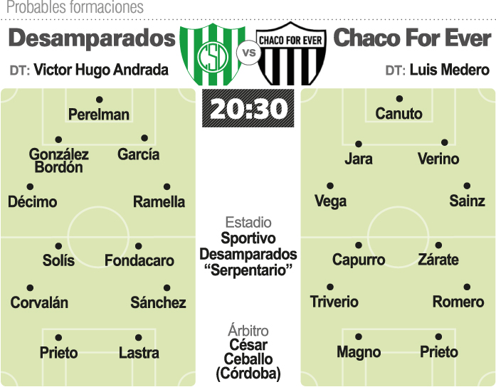 Para Desamparados el encuentro será clave porque en este mini-torneo de siete fechas (clasificará a los dos primeros y al mejor tercero a la Tercera Fase del torneo que definirán el primer ascenso a la B Nacional) hacer pesar la localía es fundamental. Sportivo ya ganó en la fecha inicial ante Maipú y ahora viene de lograr un valioso empate en Chaco ante Sarmiento de Resistencia. Por eso, para que ese punto tome mucho más valor será vital lo que logre hacer hoy ante Chaco For Ever. No será fácil, porque se topará con el equipo de Luis Medero que llega golpeado: igualó en el debut en el clásico chaqueño ante Sarmiento y recibió de local una goleada ante Estudiantes de Río Cuarto, precisamente el próximo rival de Sportivo. En ese encuentro For Ever sufrió las expulsiones de Manuel Morello y Oscar Gómez, con ese panorama y un nivel lejos del pretendido por Medero, el DT realizará cinco variantes buscando la recuperación.